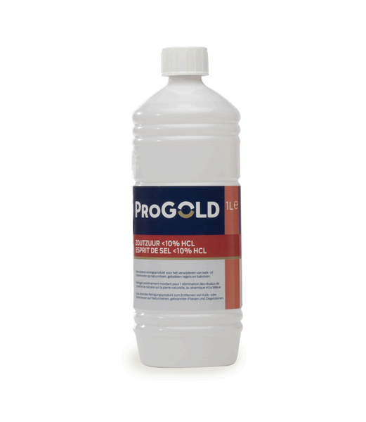 - ProGold Zoutzuur 10% is een sterk bijtend reinigingsmiddel voor het verwijderen van kalk- of cementresten op natuursteen