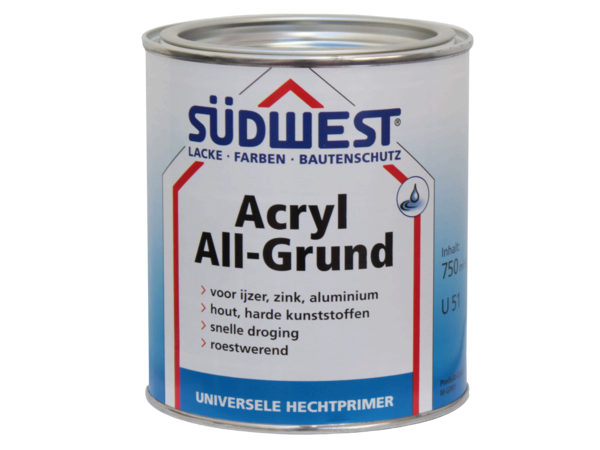 Südwest acryl allgrund is een watergedragen sneldrogende hechtprimer voor o.a. staal, verzinkt staal, ijzer, aluminium, harde kunststoffen en hout.