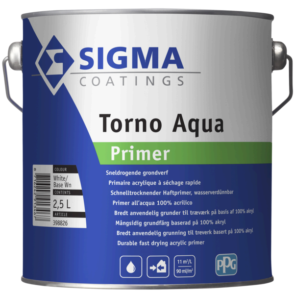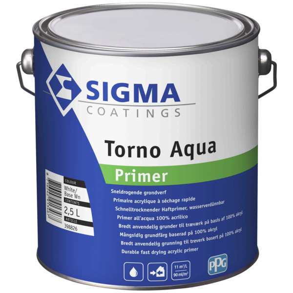 Sigma Torno Aqua Primer is een watergedragen grond- en overgrondverf voor binnen én buiten, die uitstekende hechting, goede vloei en snelle droging biedt. Verkrijgbaar in 1 L en 2,5 L.