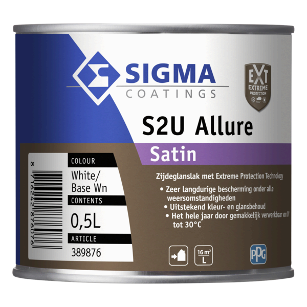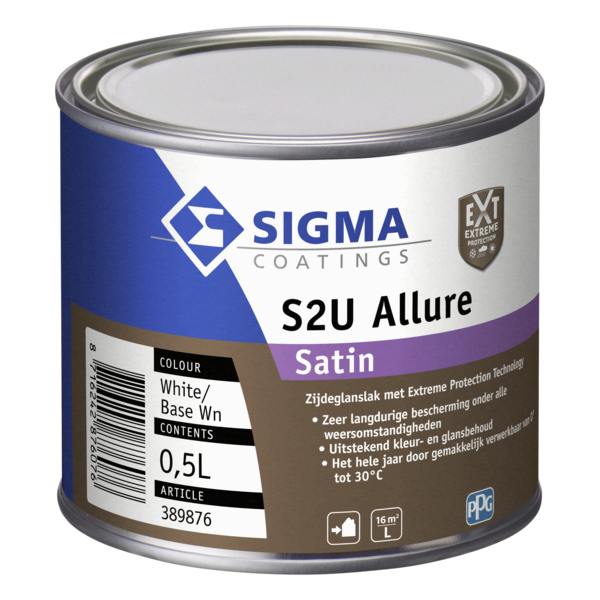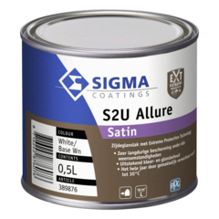 Sigma S2U Allure Satin is een zijdeglanzende, krasvaste lakverf voor buiten op basis van polyurethaan alkyd (Dual Guard System®). Kleur- en glansvast tot 10 jaar. Verwerkbaar van 0 °C tot 30 °C. Verkrijgbaar in 0,5 L, 1 L en 2,5 L.