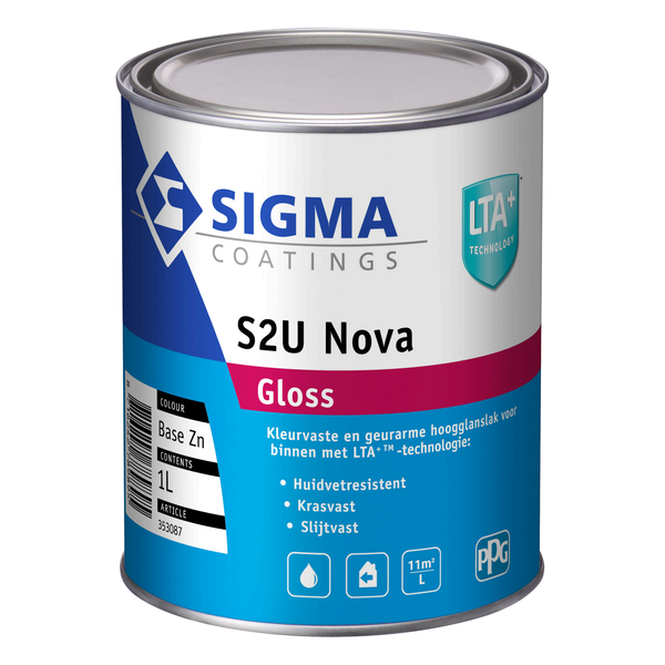 Sigma S2U Nova Gloss is een sterk glanzende lakverf voor binnen. De lak is kras- en slijtvast, met LTA+ technologie, bestand tegen huidvet en intensief gebruik. Sigma S2U Nova Gloss is geschikt voor hout, metaal en bestaande verflagen.
