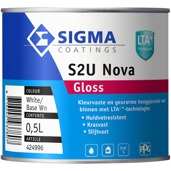 Sigma S2U Nova Gloss is een sterk glanzende lakverf voor binnen. De lak is kras- en slijtvast, met LTA+ technologie, bestand tegen huidvet en intensief gebruik. Sigma S2U Nova Gloss is geschikt voor hout, metaal en bestaande verflagen.