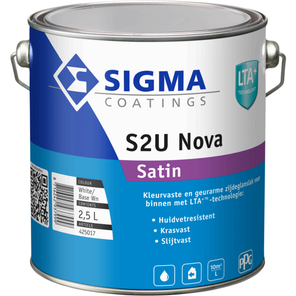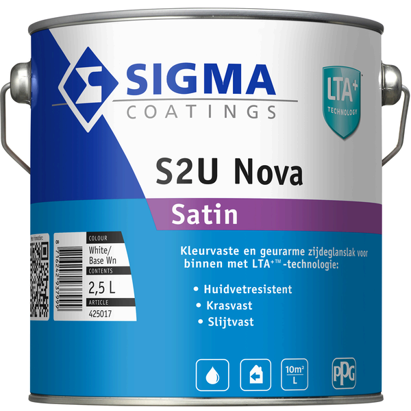 Sigma S2U Nova Satin is een watergedragen, zijdeglanzende lakverf voor binnen met LTA+ technologie. Extreem kras- en huidvetbestendig, kleurvast en ideaal voor intensief gebruikte oppervlakken. Verkrijgbaar in 0,5 L, 1 L en 2,5 L.