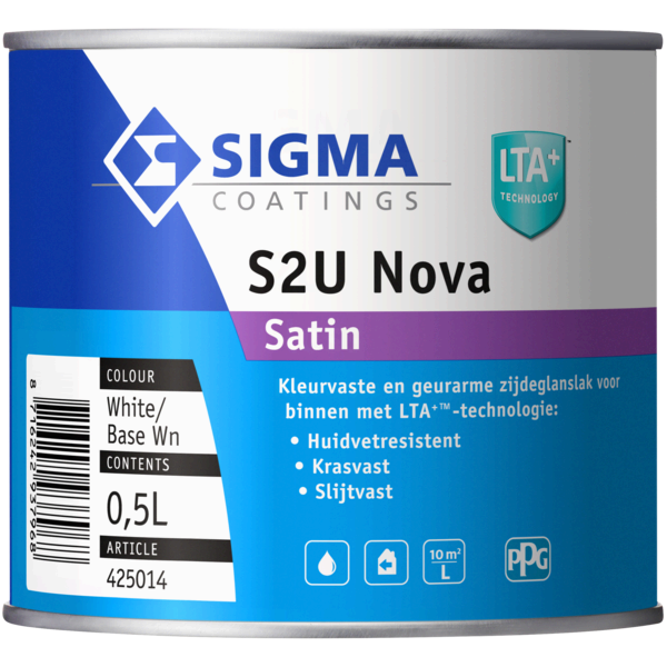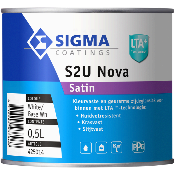 Sigma S2U Nova Satin is een watergedragen, zijdeglanzende lakverf voor binnen met LTA+ technologie. Extreem kras- en huidvetbestendig, kleurvast en ideaal voor intensief gebruikte oppervlakken. Verkrijgbaar in 0,5 L, 1 L en 2,5 L.