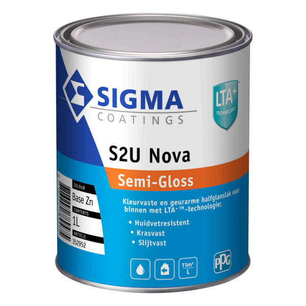 Sigma S2U Nova Semi-Gloss is een hoogwaardige, watergedragen halfglanzende lakverf voor binnen op basis van polyurethaan-acrylaat met LTA+-technologie: kras- en huidvetbestand, ideaal voor intensief gebruikt houtwerk en metaal.