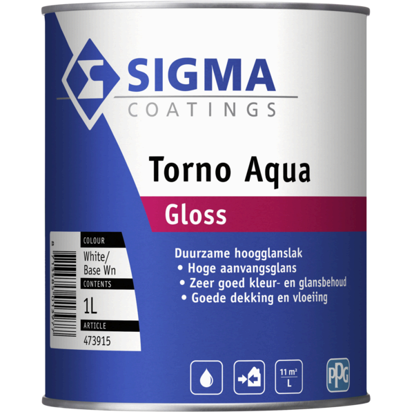 Sigma Torno Aqua Gloss is een hoogwaardige, watergedragen hoogglans lakverf voor zowel binnen als buiten, met uitstekend kleur- en glansbehoud. Verkrijgbaar in 1 L en 2,5 L.