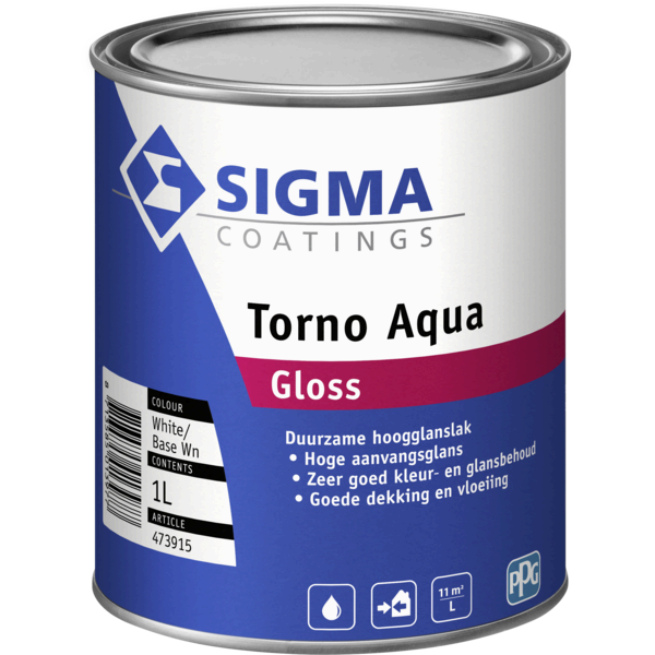 Sigma Torno Aqua Gloss is een hoogwaardige, watergedragen hoogglans lakverf voor zowel binnen als buiten, met uitstekend kleur- en glansbehoud. Verkrijgbaar in 1 L en 2,5 L.