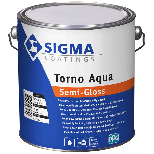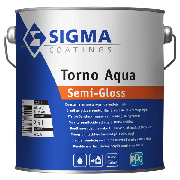 Sigma Torno Aqua Semi-Gloss is een watergedragen halfglanzende lakverf voor binnen en buiten met hoge duurzaamheid, goed kleur- en glansbehoud en breed inzetbaar op hout, staal en non-ferrometalen. Verkrijgbaar in 1 L en 2,5 L.