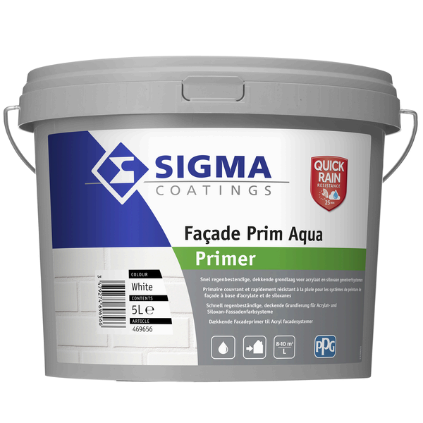 Sigma Façade Prim Aqua is een dekkende, watergedragen gevelprimer voor buiten. Reguleert zuiging, verbetert hechting, dekt uitstekend en is snel regenbestendig. Verkrijgbaar in 5 L en 10 L.