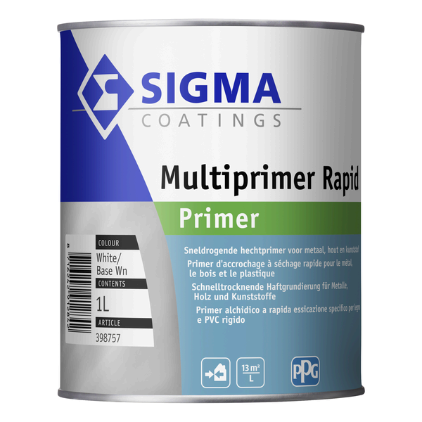 Sigma Multiprimer Rapid is een sneldrogende hechtprimer voor buiten op basis van gemodificeerde alkydhars, geschikt voor hout, staal, verzinkt staal en diverse kunststoffen. Verkrijgbaar in 1 L en 2,5 L.