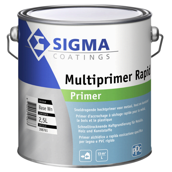 Sigma Multiprimer Rapid is een sneldrogende hechtprimer voor buiten op basis van gemodificeerde alkydhars, geschikt voor hout, staal, verzinkt staal en diverse kunststoffen. Verkrijgbaar in 1 L en 2,5 L.