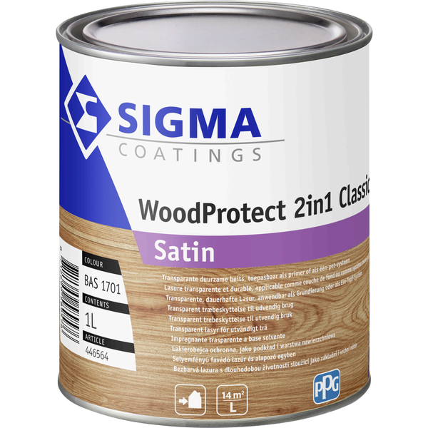 Sigma WoodProtect 2in1 Classic Satin is een transparante, terpentinegedragen impregneerbeits voor buiten die hout beschermt én de houtnerf accentueert. Ideaal voor kozijnen, deuren, rabatwerk, tuinhout en blokhutten. Verkrijgbaar in 1 en 2,5 L.