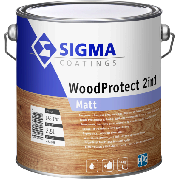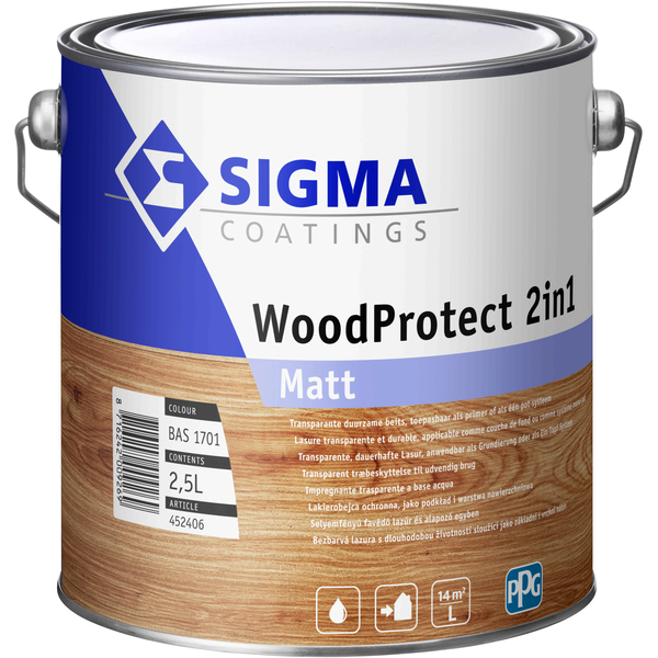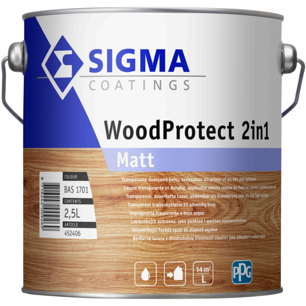 Sigma WoodProtect 2in1 Matt is een watergedragen, transparante impregneer¬beits voor binnen én buiten. De matte afwerking accentueert de houtnerf en beschermt tegen vocht. Ideaal voor kozijnen, deuren, tuin- en rabathout. Verkrijgbaar in 1 en 2,5 L.