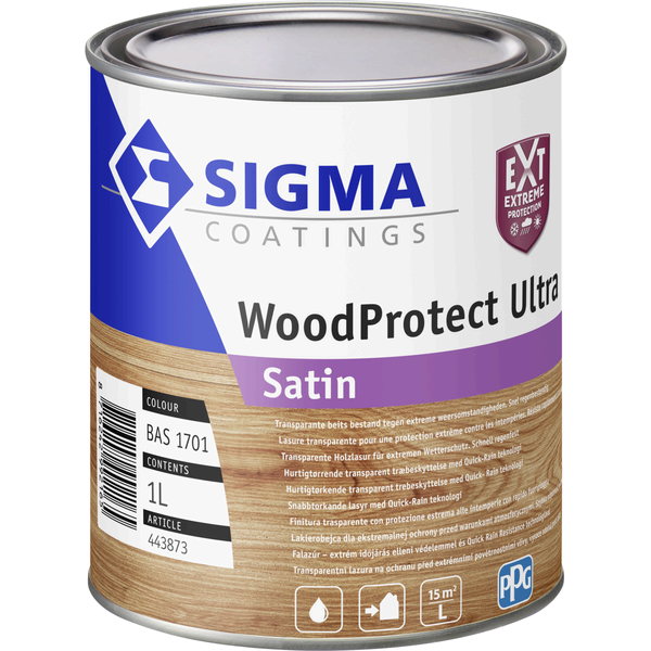 Sigma WoodProtect Ultra Satin is een watergedragen, transparante zijdeglans-beits voor binnen en buiten. Snel regenbestendig en met sterke uv-, vocht- en weerbestendigheid. Ideaal voor kozijnen, ramen, deuren en ander houtwerk.