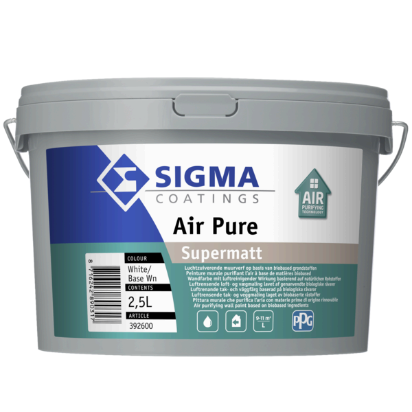 Sigma Air Pure Supermatt is een watergedragen, supermatte muurverf voor binnenshuis, op basis van biobased grondstoffen en met luchtzuiverende werking. Verkrijgbaar in 2,5 L en 10 L.