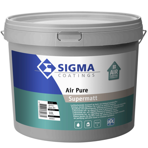 Sigma Air Pure Supermatt is een watergedragen, supermatte muurverf voor binnenshuis, op basis van biobased grondstoffen en met luchtzuiverende werking. Verkrijgbaar in 2,5 L en 10 L.