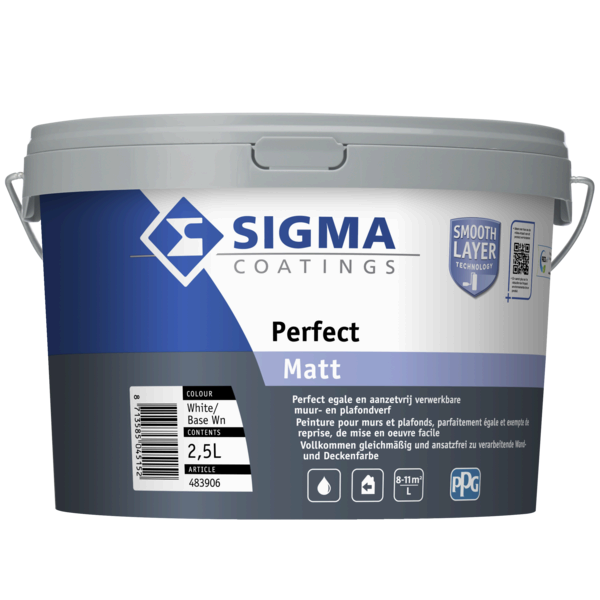 Sigma Perfect Matt is matte én duurzame muurverf voor binnen o.b.v. 100% acrylaatdispersie. De verf is aanzetvrij, bij te werken zonder kleurverschil en geschikt voor wanden en plafonds. Koop Perfect Matt voor een egaal resultaat.