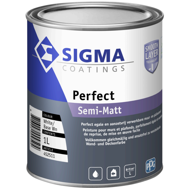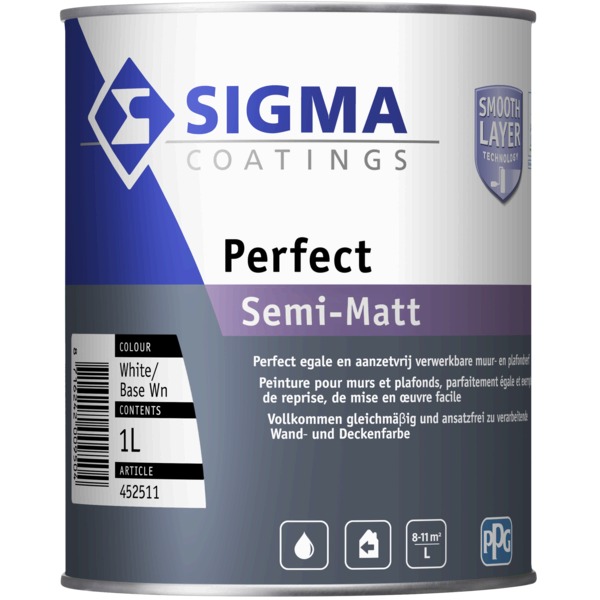 Sigma Perfect Semi Matt is een hoogwaardige, zijdeglanzende (semi matte) muur- en plafondverf voor binnen op basis van 100 % acrylaat met PU-additief. Aanzet- en baanvrij, en met EU Ecolabel-certificering. Verkrijgbaar in 1 L, 2,5 L, 5 L en 10 L.
