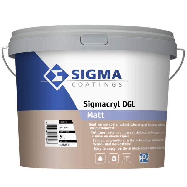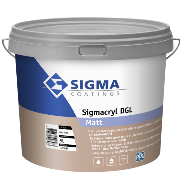 Sigmacryl DGL Matt is een goed dekkende matte muurverf voor binnen. Geschikt voor wanden en plafonds in droge ruimtes. Voor onderhoudsschilderwerk of nieuwbouw. Verkrijgbaar in 1 L, 2,5 L, 5 L en 10 L.
