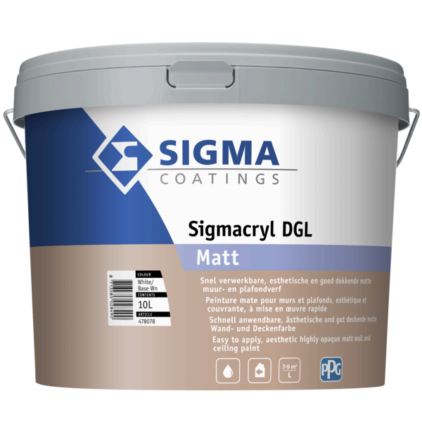 Sigmacryl DGL Matt is een goed dekkende matte muurverf voor binnen. Geschikt voor wanden en plafonds in droge ruimtes. Voor onderhoudsschilderwerk of nieuwbouw. Verkrijgbaar in 1 L, 2,5 L, 5 L en 10 L.