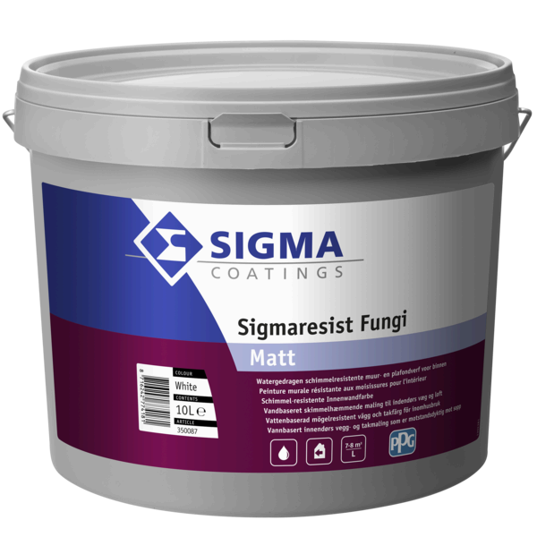 Sigmaresist Fungi Matt is een hygiënische, schimmelwerende matte muurverf voor binnen. Bestand tegen vocht, schimmels en algen. Hoge dekking en waterdampdoorlatend. Verkrijgbaar in 2,5 L en 10 L.