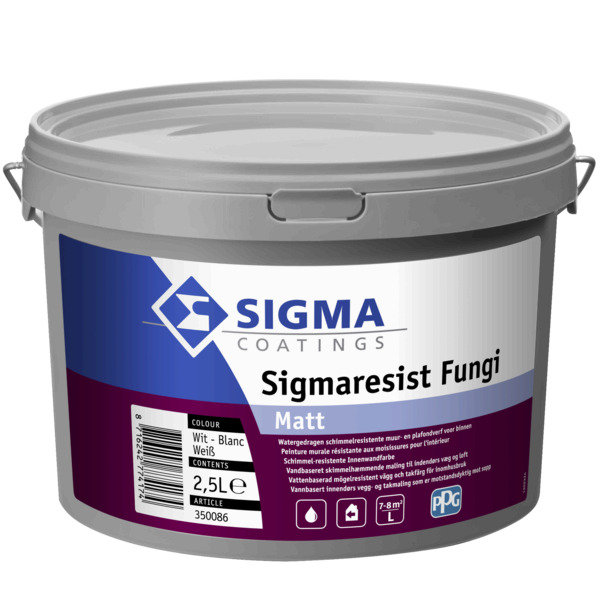 Sigmaresist Fungi Matt is een hygiënische, schimmelwerende matte muurverf voor binnen. Bestand tegen vocht, schimmels en algen. Hoge dekking en waterdampdoorlatend. Verkrijgbaar in 2,5 L en 10 L.