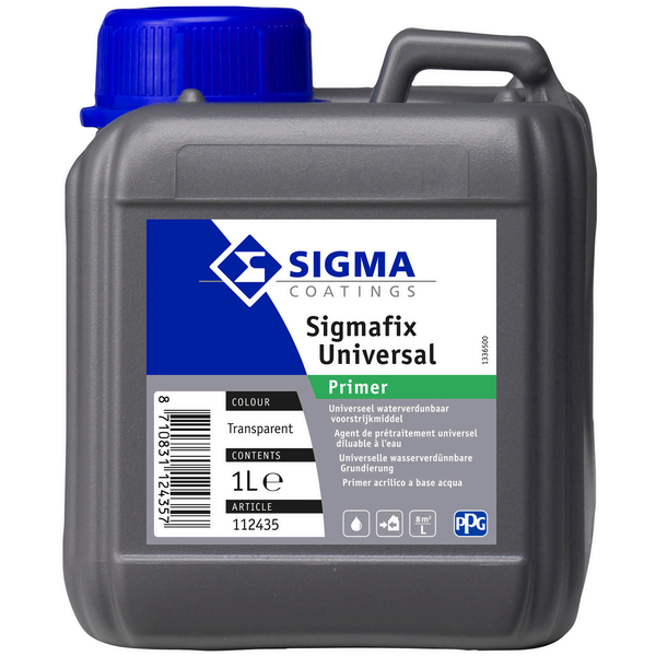 Sigma Sigmafix Universal Primer is een transparante, universele voorstrijk voor binnen en buiten. Reguleert zuiging, fixeert poederende ondergrond en verbetert hechting van muurverf. Verkrijgbaar in 2,5 L en 5 L.